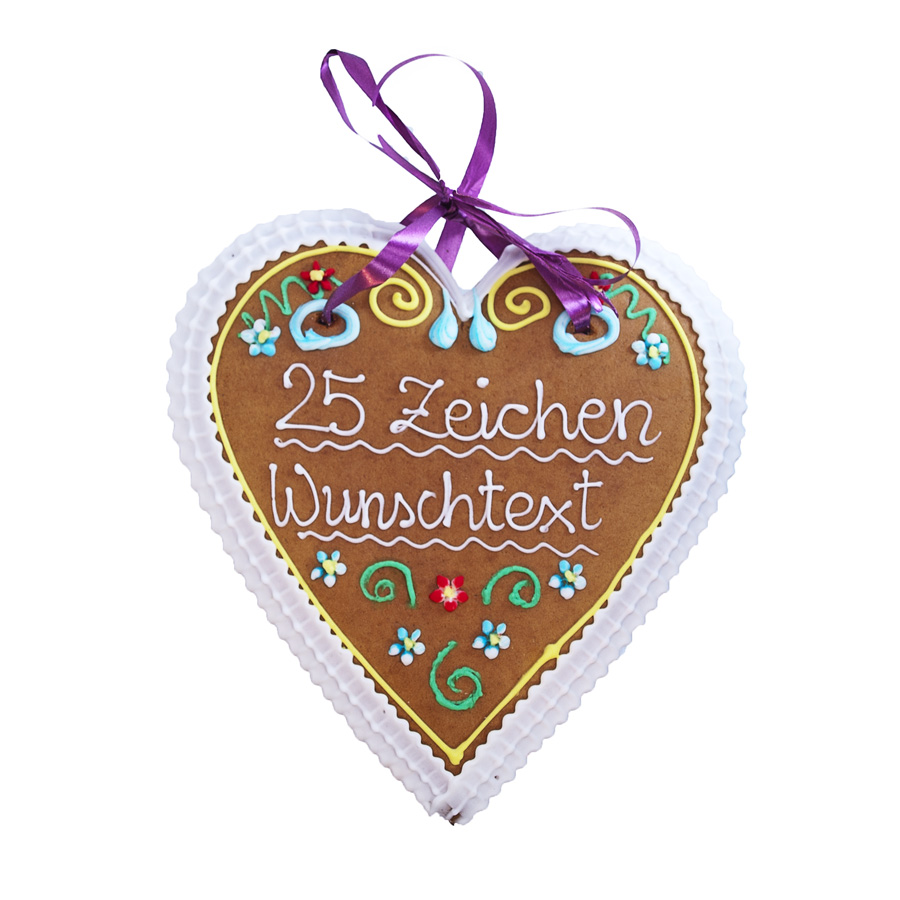 Handgeschrieben und bunt verziert auf braunem Lebkuchenherz natur. Mit färbigem Umhängeband, verpackt in Folie.