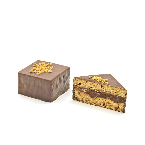 Feiner Honiglebkuchen mit viel gutem Honig (ca. 28%), mit Schokoladen-Weinbrand Creme gefüllt und mit Edelbitterschokolade überzogen.
