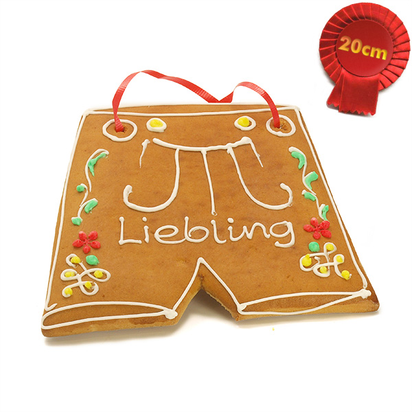 Startseite » Lebkuchenherzen » 20cm Lebkuchen Lederhose verziert, Handschrift mit Wunschtext (max. 15 Zeichen) - A