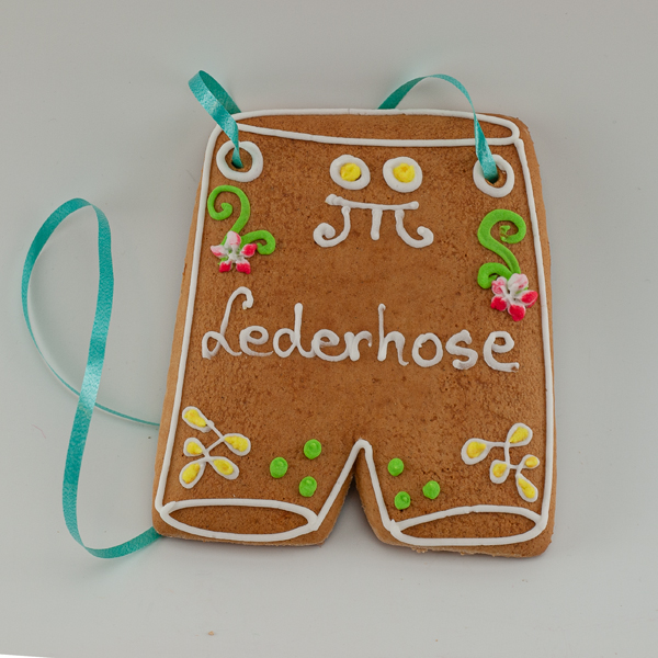 Lebkuchen in Lederhosenform, handgeschrieben und bunt verziert. Mit färbigem Umhängeband, in Folie verpackt.