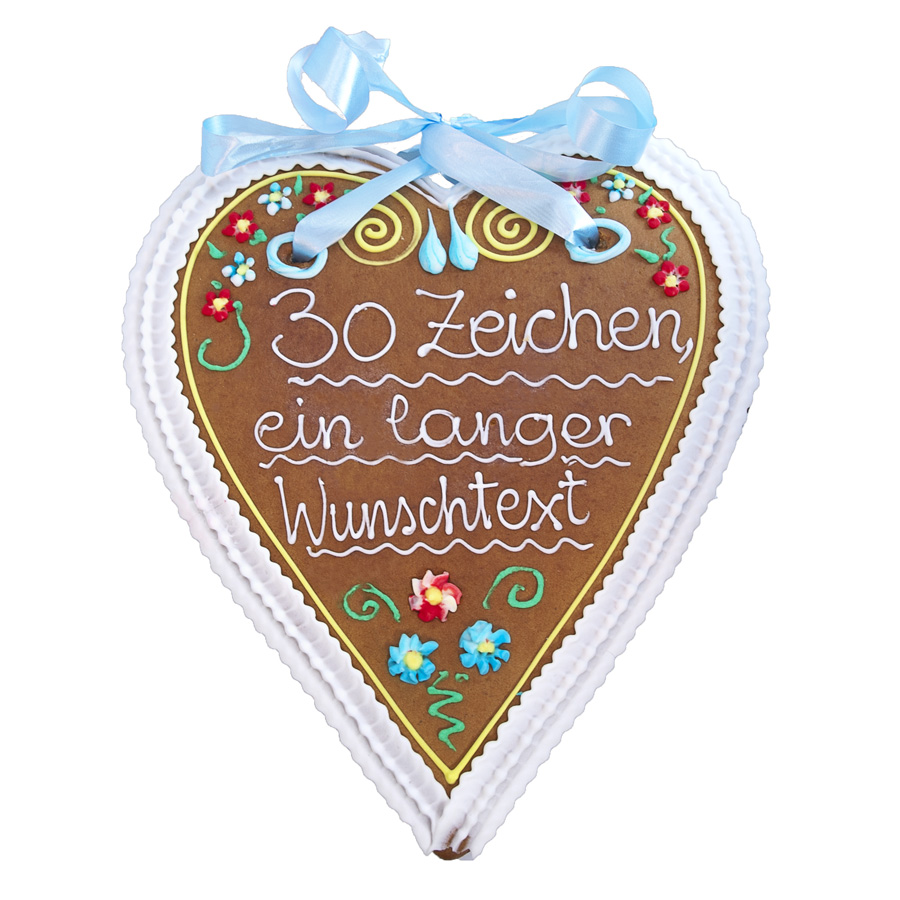 Handgeschrieben und bunt verziert auf braunem Lebkuchenherz natur. Mit färbigem Umhängeband, verpackt in Folie.