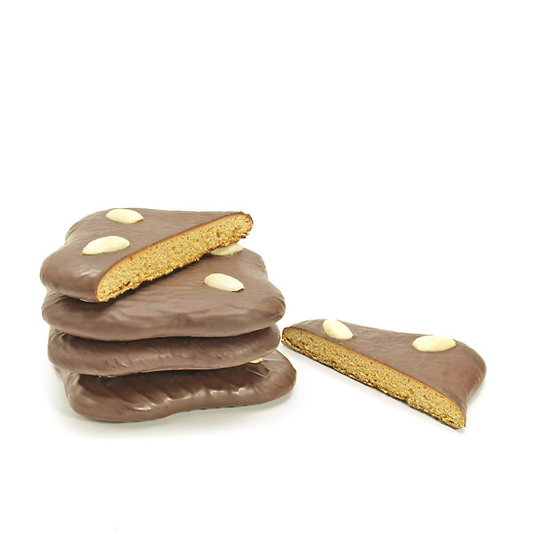 Feiner Honiglebkuchen mit viel gutem Honig (ca. 28%), in Schokoglasur getunkt und mit Mandeln belegt.