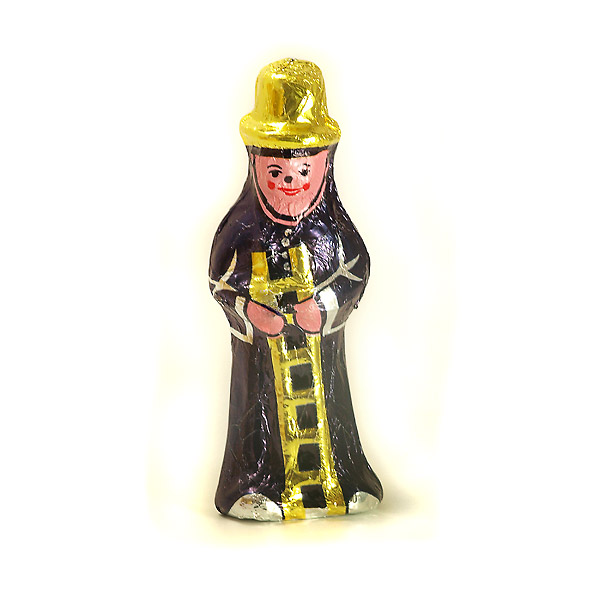 Kaminfeger mit Leiter. Beste Vollmilchschokolade mit mindestens 45% Kakaogehalt,handgeschöpft und handgewickelt in Stanniol. Für Stilvolle Neujahrswünsche.