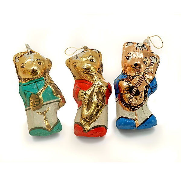 BIO Schokolade Musikbär -mit Lasche zum Aufhängen. Beste Vollmilchschokolade mit mindestens 41% Kakaogehalt,handgeschöpft und handgewickelt in bedrucktes Staniol. Christbaumbehang wie früher eben -nur ist unsere Schokolade BIO Zertifiziert! Höhe: ca. 6cm Gewicht: ca. 12g Stück