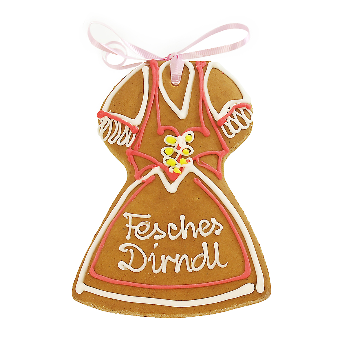 Lebkuchen in Dirndlform, handgeschrieben und bunt verziert. Mit färbigem Umhängeband, in Folie verpackt.