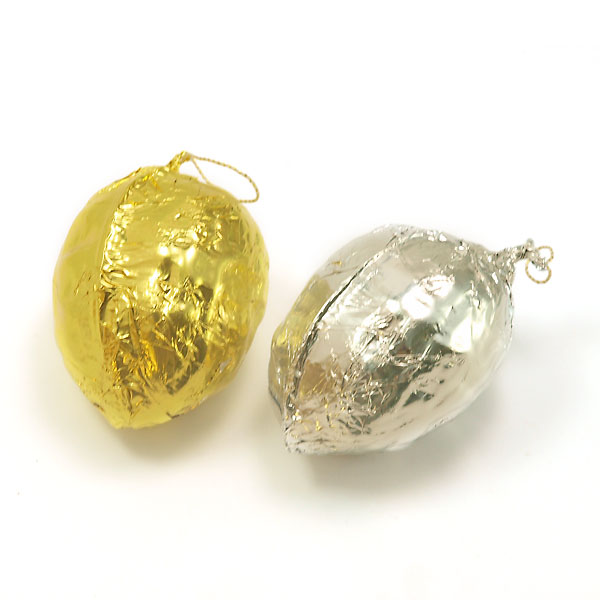 Startseite » Schokoladefiguren » Christbaumfiguren » BIO Schokoladefigur Nusse gold-silber - G